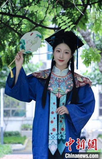 山東大學2024屆畢業生姜藝身穿學位服,肩掛“海闊天高”云肩,頭戴非遺絨花學位帽。(資料圖,山東大學供圖)