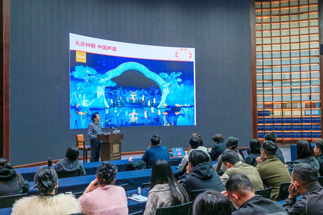 李幼平教授的講座分為“八音諧鳴、禮樂(lè)鐘磬”“中國(guó)故事、守正創(chuàng)新”“大國(guó)重器、中國(guó)聲音”三大部分。首先從介紹金、石、木、革、匏、土、絲、竹“八音”講起,以曾侯乙編鐘研究、宋代大晟鐘的制作為切入點(diǎn),分析禮樂(lè)和編鐘的關(guān)系,介紹了編鐘的形制、演奏特點(diǎn)及其在中國(guó)禮樂(lè)發(fā)展史上的重大作用,闡釋了編鐘由響器到禮器、由禮器到樂(lè)器、由樂(lè)器到律器的文化發(fā)展內(nèi)涵。從“發(fā)出聲響”、到“以禮節(jié)人”、再到“音律之器”,編鐘的發(fā)展體現(xiàn)了中國(guó)古代文明的一次次禮樂(lè)文化復(fù)興的演進(jìn)歷程。編鐘是人類古代物質(zhì)文明與精神文明的偉大創(chuàng)造,是當(dāng)代中國(guó)講述中國(guó)故事的中國(guó)聲音。李教授通過(guò)自身的研究與創(chuàng)作,通過(guò)一系列國(guó)家重大文藝活動(dòng)及外事活動(dòng)中編鐘演奏的實(shí)例,展現(xiàn)了當(dāng)代中國(guó)編鐘文化事業(yè)建設(shè)的成就,指出對(duì)編鐘古典音樂(lè)進(jìn)行創(chuàng)造性轉(zhuǎn)化和創(chuàng)新性發(fā)展能夠使其永葆生命力。